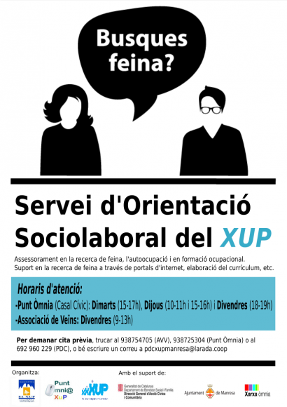 L'espai d'orientació sociolaboral és obert a persones tant del barri com de fora i se'n pot fer ús tant al Punt Òmnia com al local de l'AAVV del barri. Per a més informació podeu contactar per telèfon al 93 872 53 04 o enviant un correu electrònic a pdcxupmanresa@larada.coop.