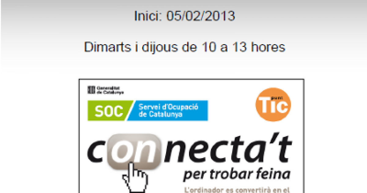 El programa Connecta’t és una col·laboració entre el Servei d’Ocupació de Catalunya (SOC) i la Direcció General de Telecomunicacions i Societat de la Informació (DGTSI) per impartir formació informàtica bàsica a persones que es troben a l’atur i que estan inscrites com a demandants d’ocupació.